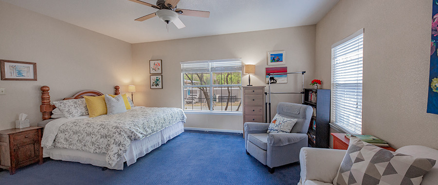 During your stay, admire the beautiful Texas skies on the front porch or enjoy the tree-lined green space where you can make friends with a clutch of happy hens. Other amenities include a private parking spot next to the front porch, a washer and dryer, comfortable seating throughout the space, a wall-mounted Fire Tv, Wifi, and a full kitchen with essential utensils and appliances. This house can accommodate three adult guests or two adults with two small children. It also provides a comfortable stay for individuals with mobility challenges by offering wheelchair accessible parking leading to a step-free ramp entrance, 35" wide doorways, and bathroom grab bars. Sleeping arrangements include an oversized bedroom that boasts a king-sized bed—you can find alternate sleeping spaces on a comfortable sofa or settle in on the supersized love sac set, both located in the living area.